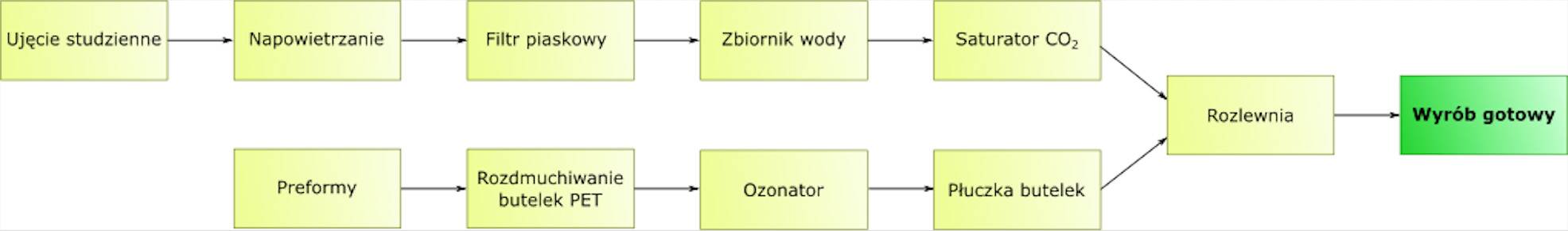 Schemat przykładowego ciągu technologicznego do produkcji butelkowanej wody mineralnej nasycanej CO2 przedstawiono poniżej. Ważnym jest, aby na żadnym etapie produkcji nie wprowadzić do układu bakterii, gdyż nie ma możliwości ich późniejszego usunięcia. Napowietrzanie wody powinno być także zabezpieczone przed możliwością skażenia bakteriami np. poprzez wstępne filtrowanie. Natomiast butelki przygotowywane do napełniania powinny być płukane np. wodą ozonowaną. Dopuszczalne maksymalne stężenia w wodzie mineralnej powinny być bardzo podobne do tych ustalonych dla wody wodociągowej.