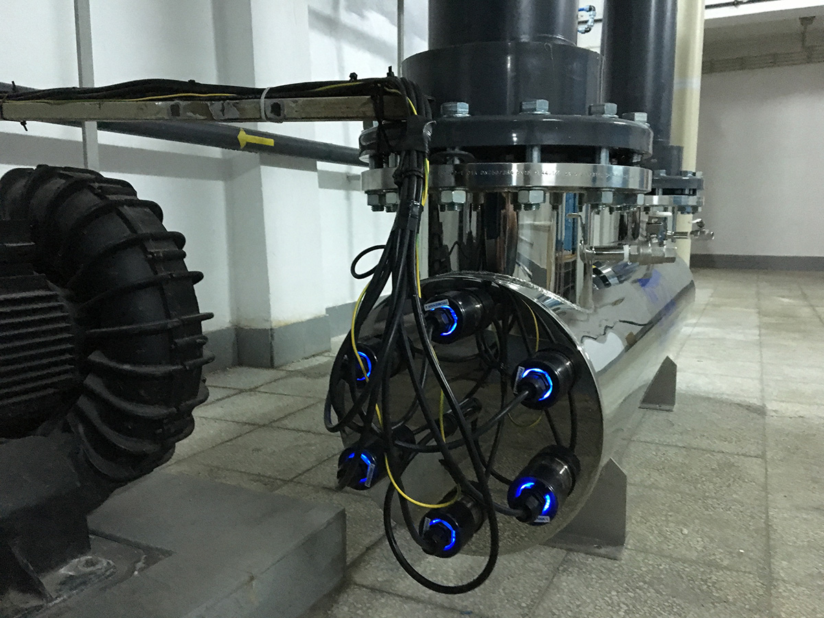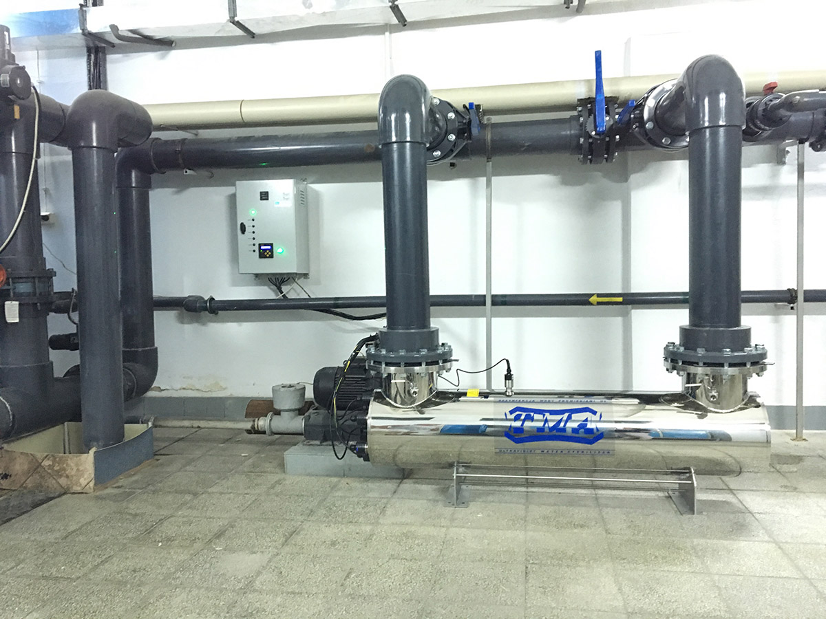 Lampa AMX-B została wpięta w układ wody cyrkulacyjnej na rurociągu tłocznym na basen.