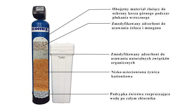 | 4 w 1 skuteczne w usuwaniu twardości, żelaza ,manganu i amoniaku. Usuwa 50% naturalnych związków organicznych | |