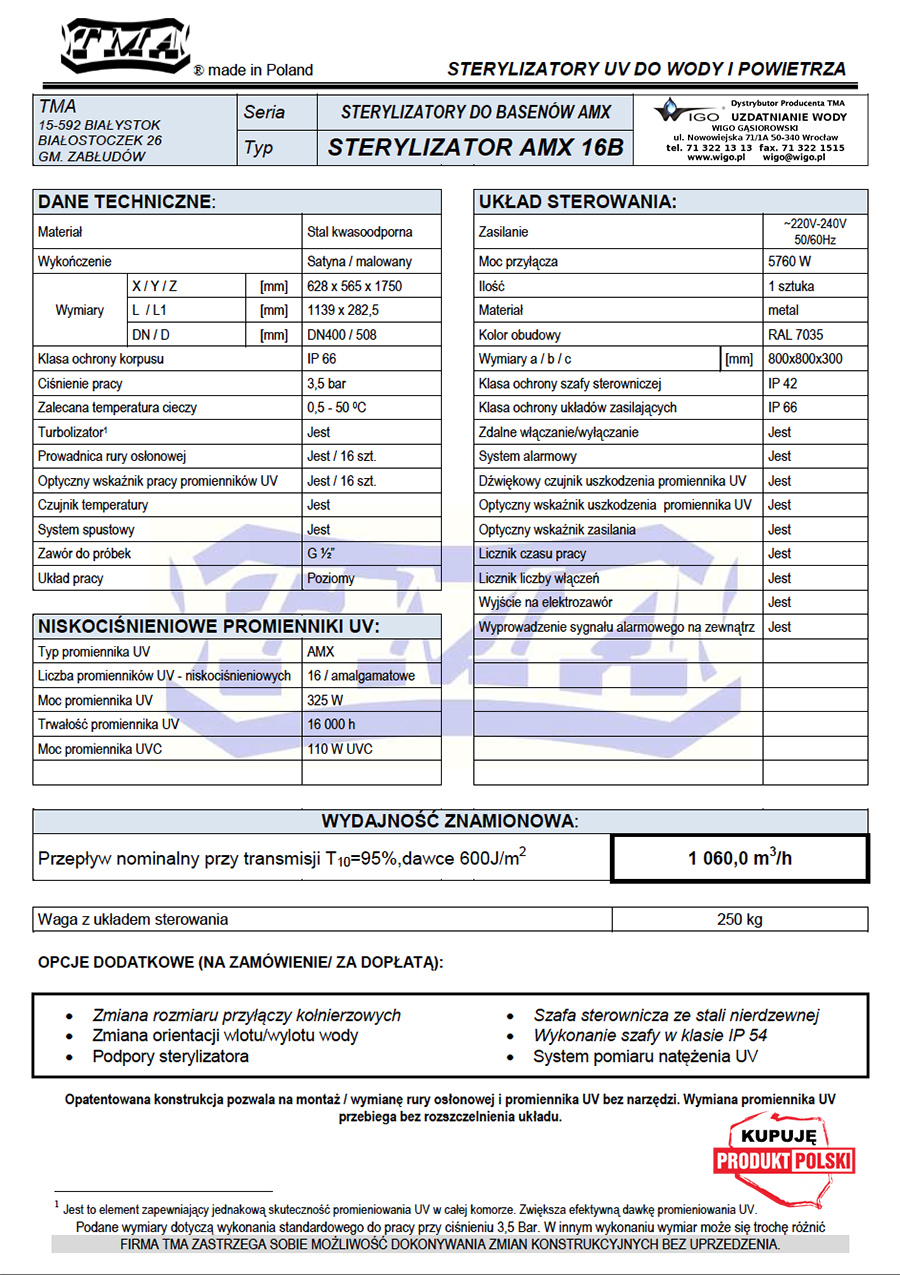 Zainstalowana lampa w technologii basenowej AMX-4, 148 m3/h przy dawce 600 J m/2, AMX-3, 93 m3/h przy dawce 600 J m/2